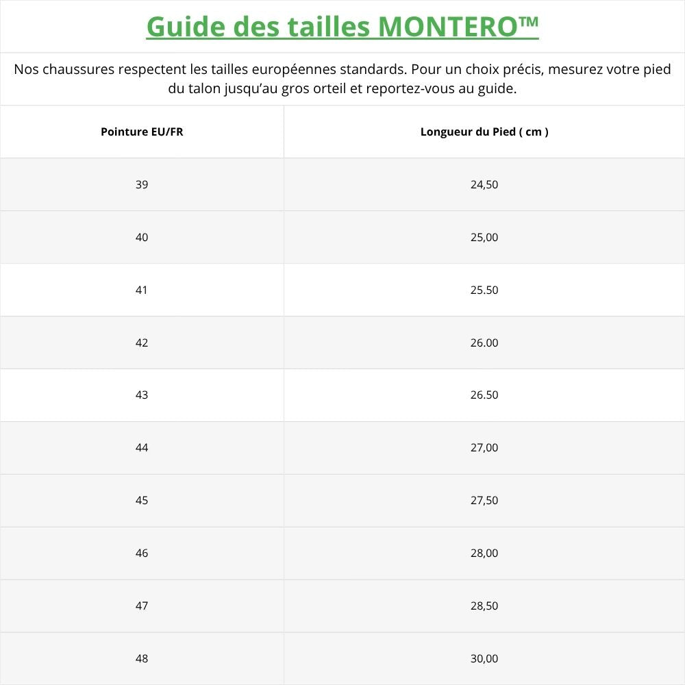 Nos chaussures respectent les tailles européennes standards.
