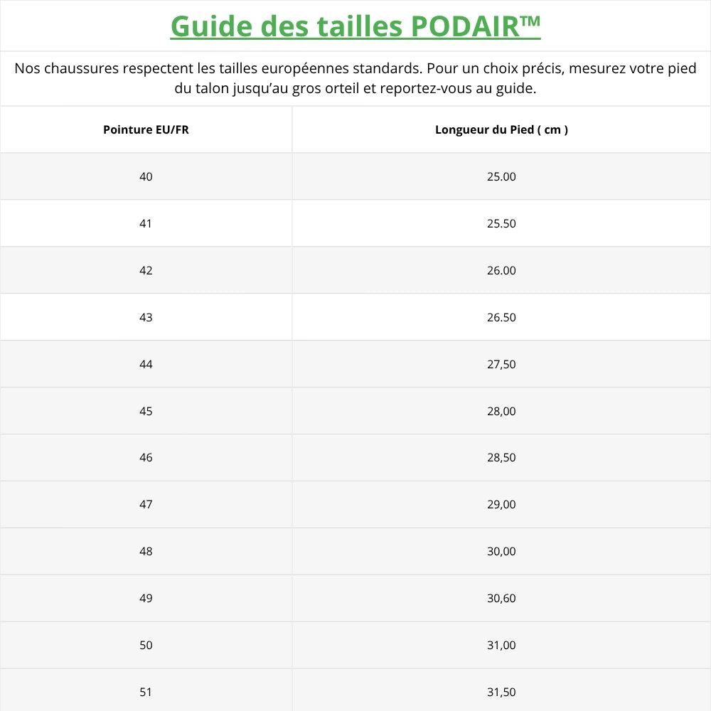 Les Podair™ sont conçues pour durer : semelle caoutchouc antidérapante renforcée, coutures solides et matériaux respirants testés pour un usage quotidien.