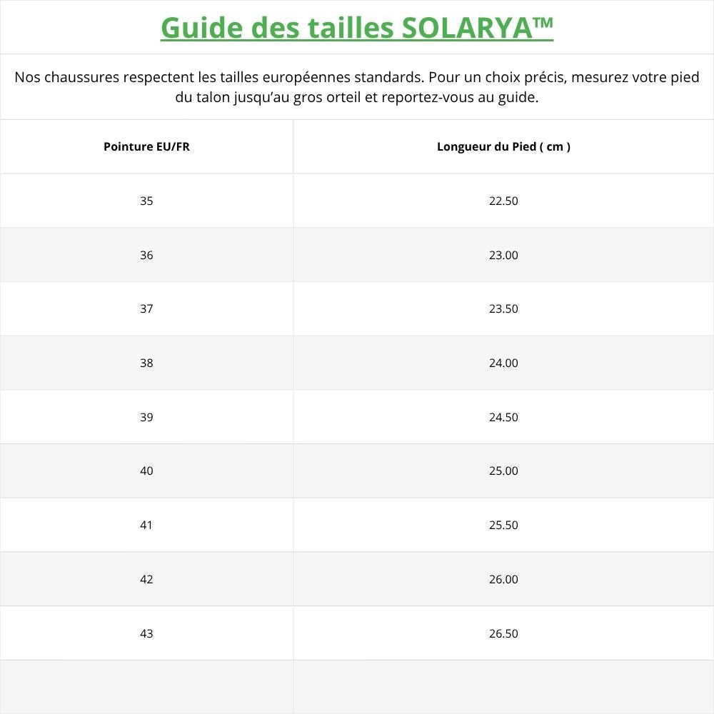 Modernes et respirantes, les chaussures Solarya™ ont été conçues pour offrir un confort durable et une stabilité optimale à chaque pas. Leur conception ergonomique s’adapte naturellement à la forme du pied, assurant une marche fluide et sans douleur, que ce soit au travail, à la maison ou en extérieur.