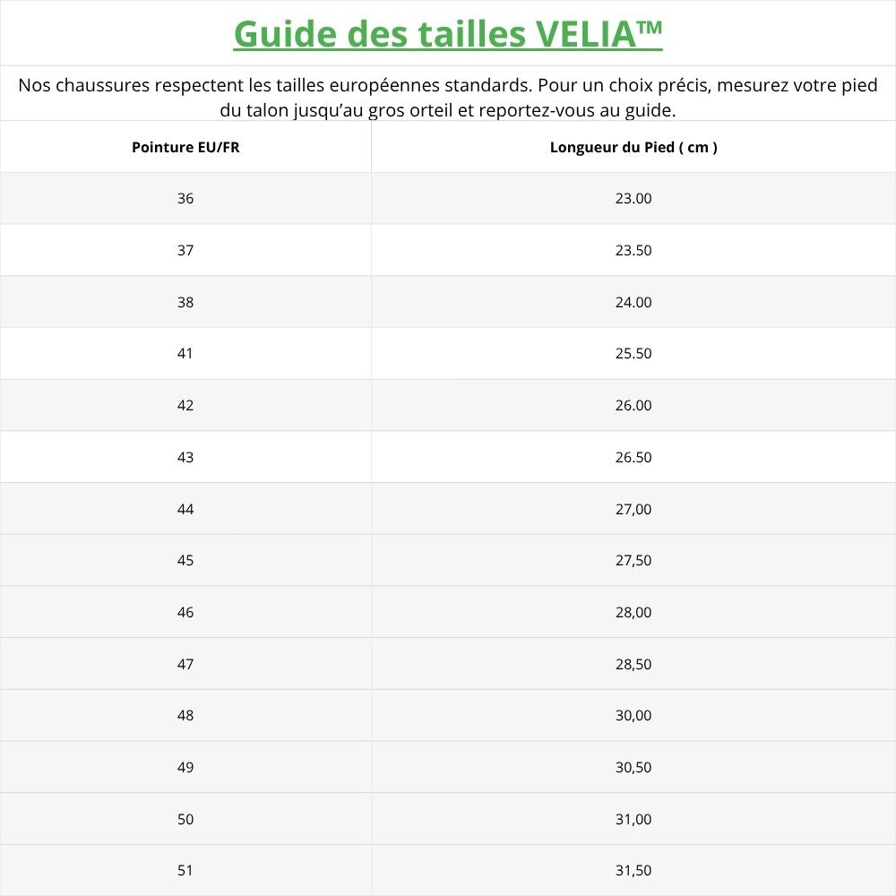 Les Velia™ taillent normalement, mais pour les pieds très larges, il est conseillé de prendre une taille au-dessus. Un guide des tailles détaillé et un retour gratuit sont disponibles pour vous garantir le bon ajustement.