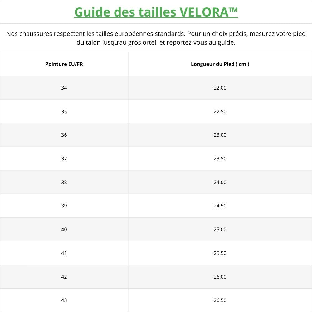 Si vous êtes entre deux tailles, choisissez simplement une taille au-dessus pour plus de confort, surtout en cas de pieds sensibles ou gonflés.
