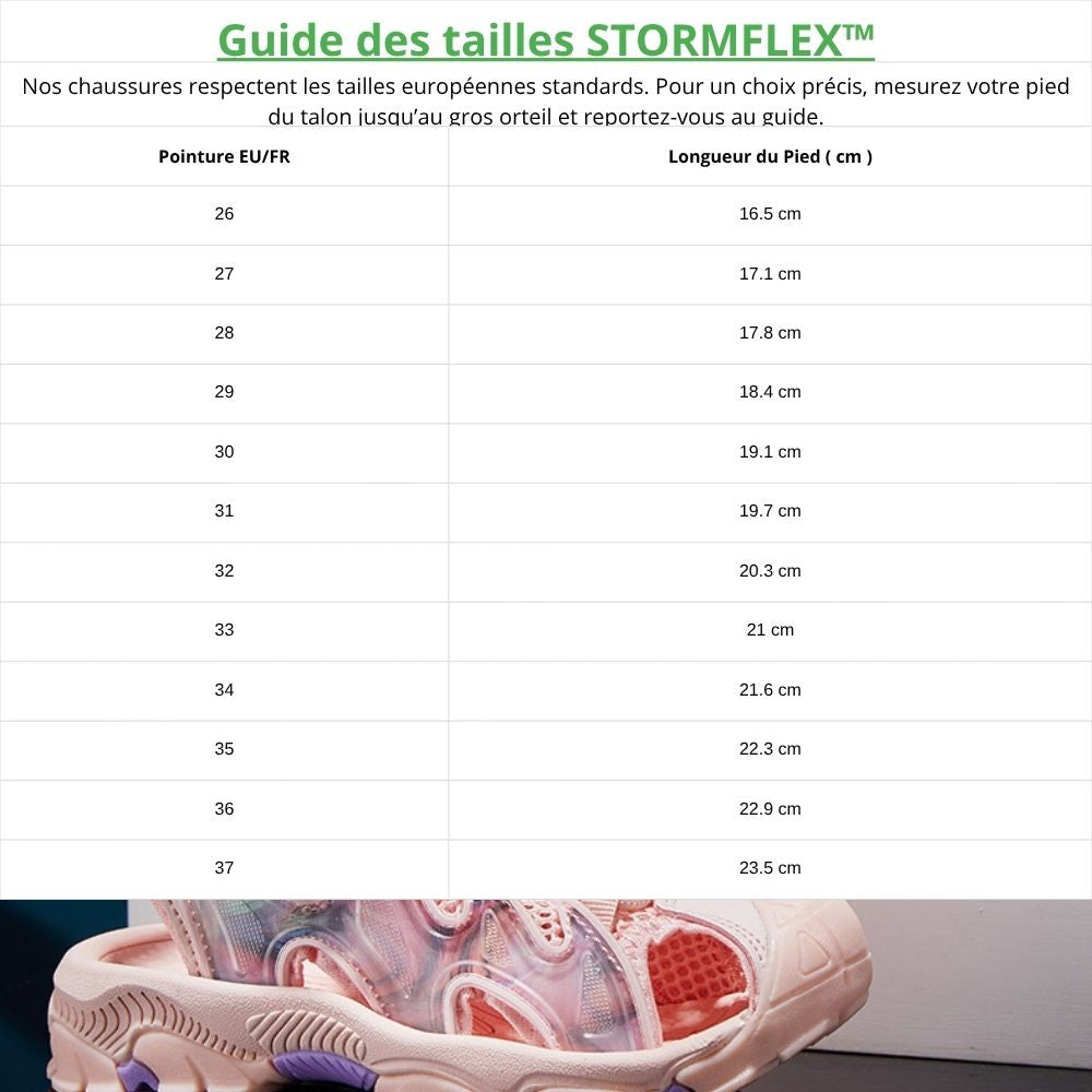 Les StormFlex™ sont conçues en mesh technique ultra-léger. Elles laissent le pied respirer et ne pèsent presque rien. Les enfants oublient même qu’ils les portent, ce qui les rend parfaites pour les longues journées d’été.